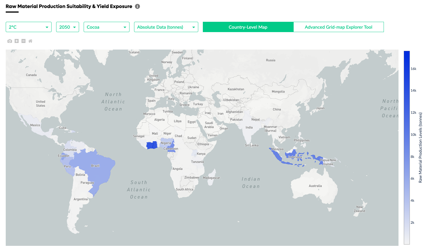 Raw material production suitability and yield exposure map for cocoa.