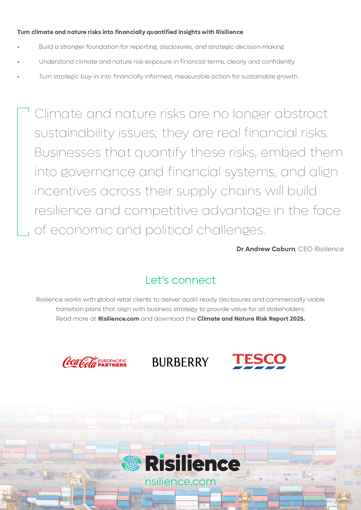 Risilience operationalises environmental intelligence across the business, driving future-focused decisions that strengthen long-term resilience to environmental risks.